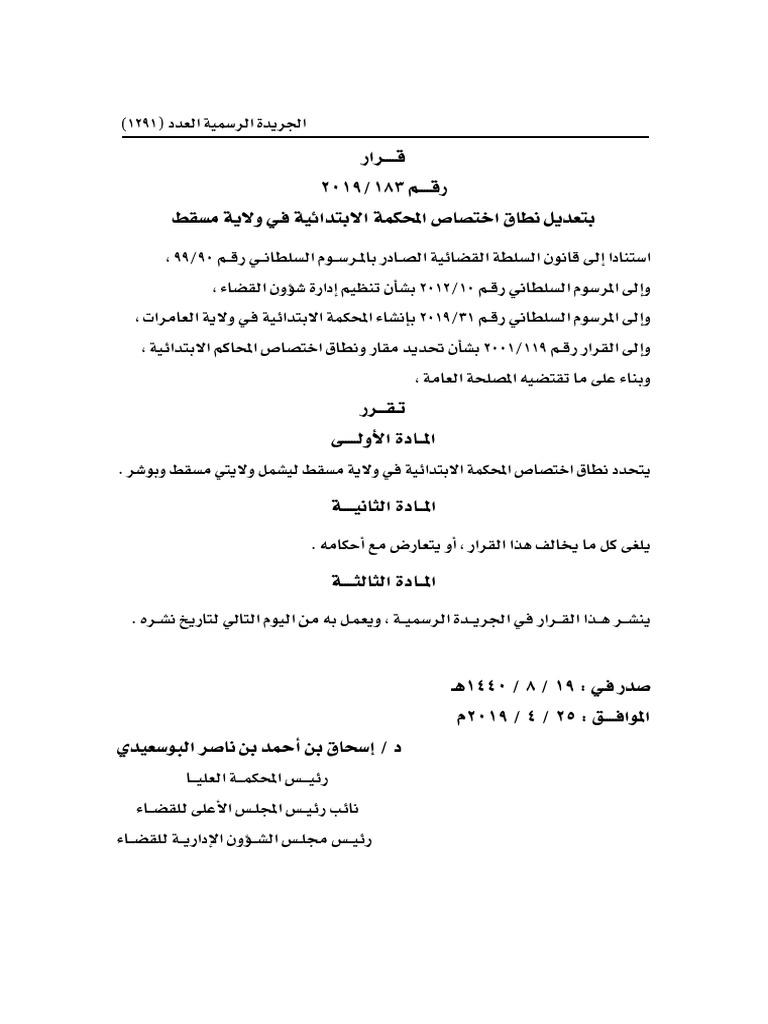 رئيس المحكمة العليا يصدر قرار ا بتعديل نطاق اختصاص المحكمة الابتدائية في ولاية مسقط